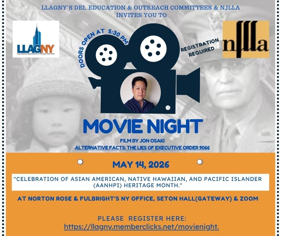 Alternative Facts: The Lies of Executive Order 9066In collaboration with NJLLA, the DEI and Education Committees of LLAGNY are presenting a move night in celebration of Asian American, Native Hawaiian, and Pacific Islander (AANHPI) Heritage Month. The event will commence at 5:30 pm with the film & talkback commencing sharply at 6pm. Individuals can attend in NJ (Seton Hall Gateway), NY (Norton Rose Fulbright)or via Zoom. Additional location details will be provided upon registration and those attending in person will need to provide a picture ID for access to the locations. Registration is open to both LLAGNY Members and Non-Members. While the event is free and open to guests, pre-registration is required so we know how many to expect. Accessibility accommodations are available upon request. Register Here |
